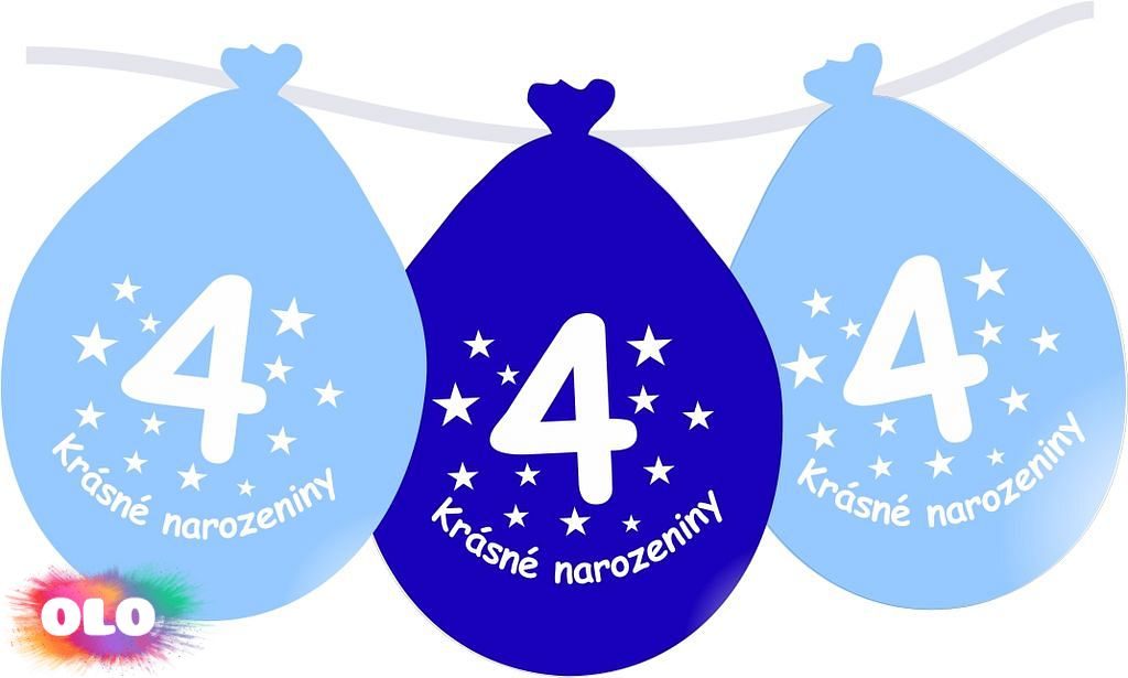 Balónek modrý KRÁSNÉ NAROZENINY číslo 4 visící - 5 ks Balonky visící číslo 4 modré mají jedinečnou výhodu, že je nemusíte nafukovat heliem, ale stačí balonek nafuknout vzduchem a zavěsit provázek popř. vytvořit z těchto narozeninových balónků balónkovou girlandu. Více informací ohledně nafukování najdete v sekci "Pumpy a příslušenství".