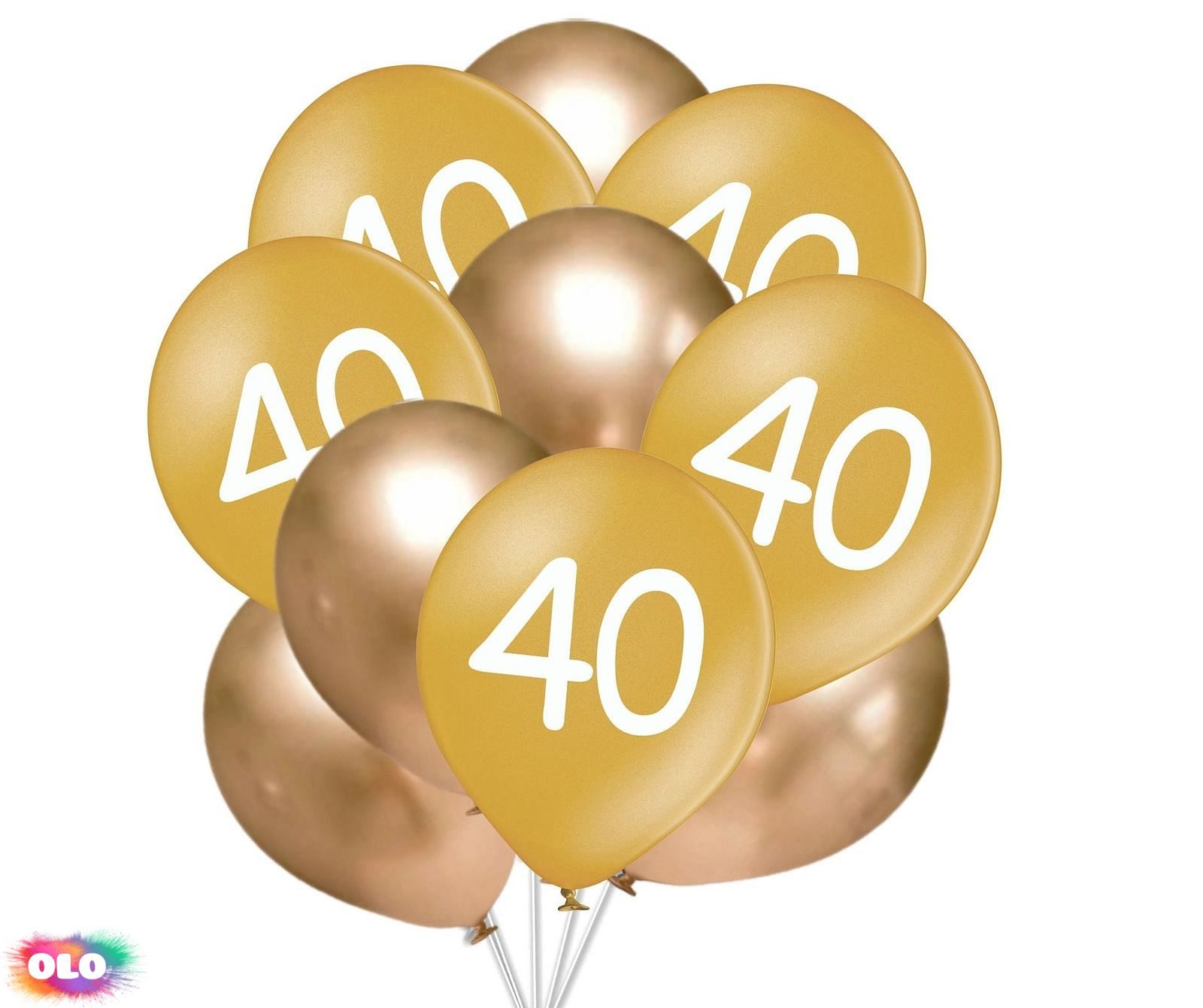 Balónky 40 narozeniny zlaté 10 ks 30 cm mix V balení je 5 x ks balónků zlatých metalických s potiskem čísla a 5 x ks balónků zlatých chromových. Průměr balónku v nafouknutém stavu je 30 cm, výška 38 cm a obvod 85-90 cm. Objem balónku je 15 L.