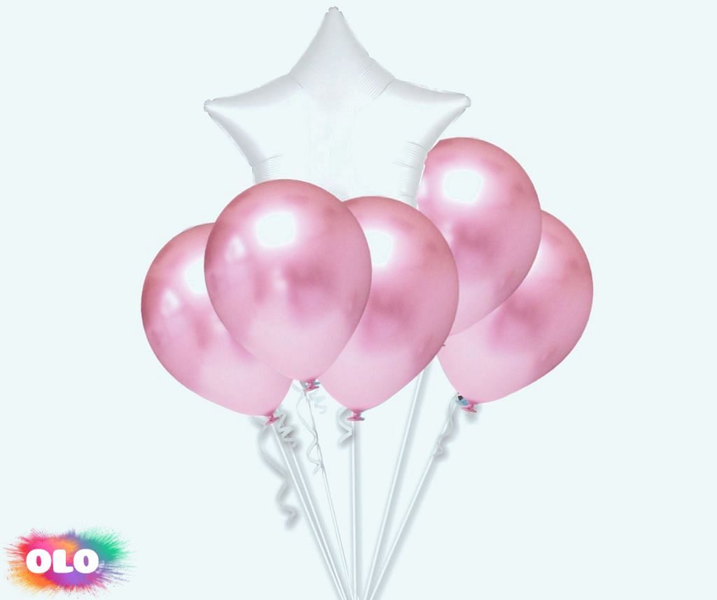 Balónky chromové světlé růžové a bílá hvězda set V balení je 6 x ks nádherných chromových světle růžových balónků průměr 30 cm a fóliový balónek bílá hvězda 42 cm. Objem chromového balónku je 15 L a fóliového balónku je 13 L. Chromové balónky v růžovém odstínu jsou elegantní dekorací pro jakoukoliv příležitost. Můžete je nafukovat heliem anebo vzduchem. Doba létání latexových balonků nafouknutých heliem je 8-12 hodin – v závislosti na objemu balónků a okolní teplotě. Delší dobu létání mají foliové balónky – několik dní. Dobu létání latexových balónků je možné prodloužit gelem HI FLOAT.