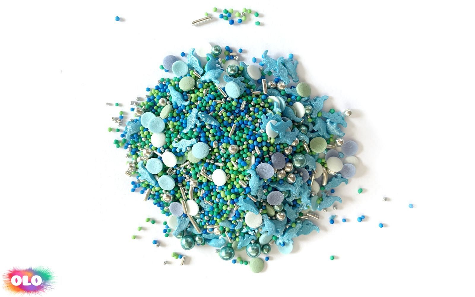 S touto směsí budou vaše dorty bezpochyby vyčnívat z davu díky poutavé barevné kombinaci modré, zelené, stříbrných čokoládových kuliček, kovových křupek a konfet ve tvaru dinosaurů.
