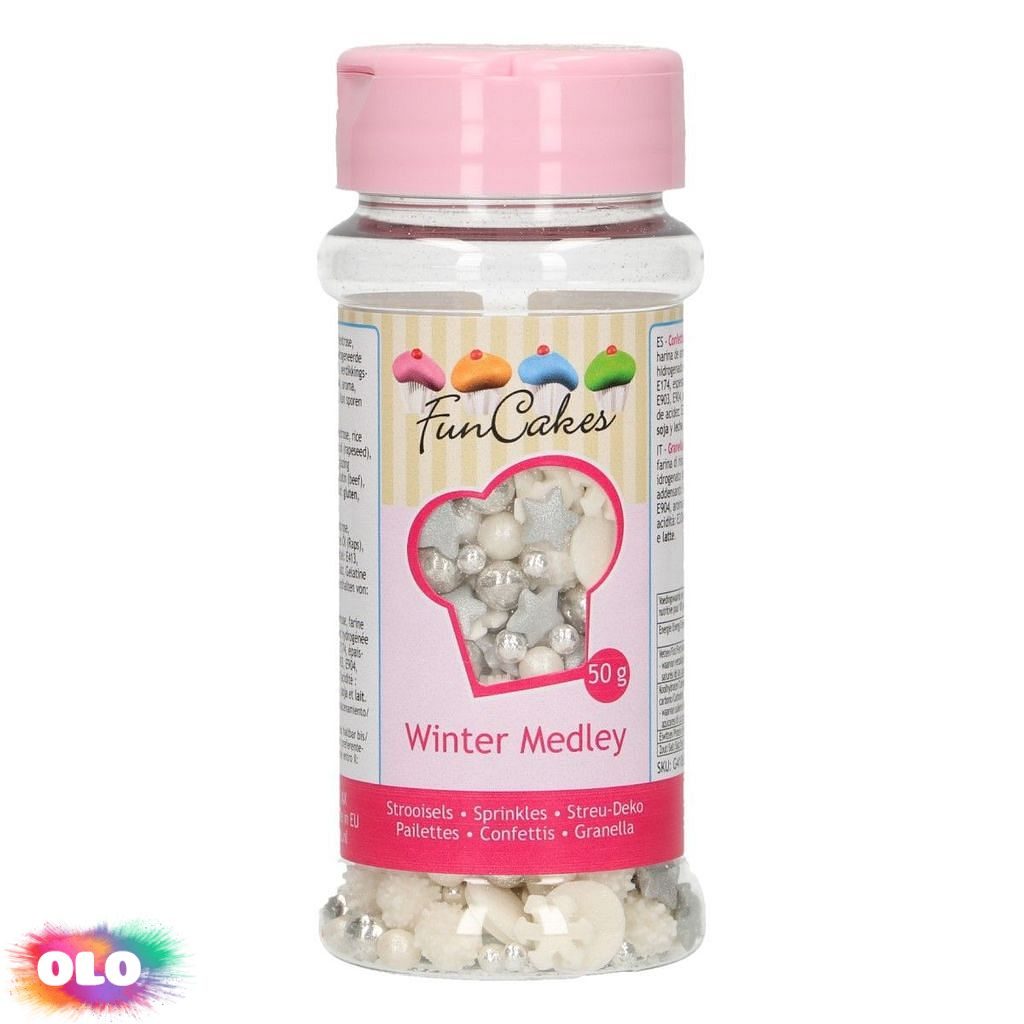 Ozdobte své cupcakes, brownies nebo dezerty se zimní tematikou touto zábavnou směsí posypů od FunCakes. Směs obsahuje různé bílé a stříbrné posypky pro krásný výsledek.