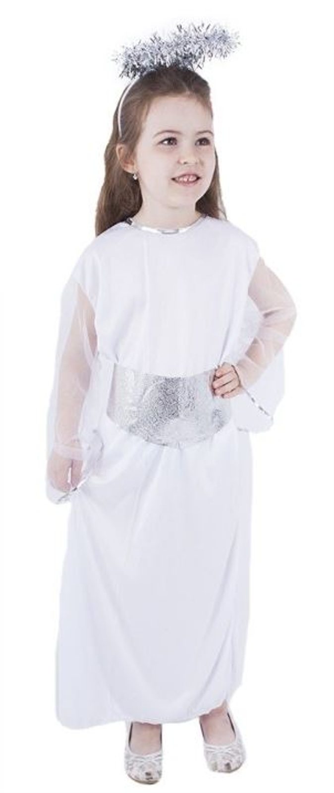 Půvabný karnevalový kostým s motivem anděla ve stříbrno-bílé barvě a velikosti S je určen pro holčičky ve věkovém rozmezí 4-6 let (110-116 cm). Balení obsahuje svatozář, pásek a šaty.
