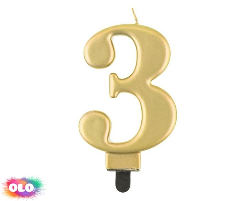 Elegantní zlatá svíčka ve tvaru čísla 3, nesmí chybět na žádném narozeninovém dortu. Svíčka je opatřena plastovým podstavcem, který Vám umožní snadné umístění na dort. Výška svíčky je 8 cm.