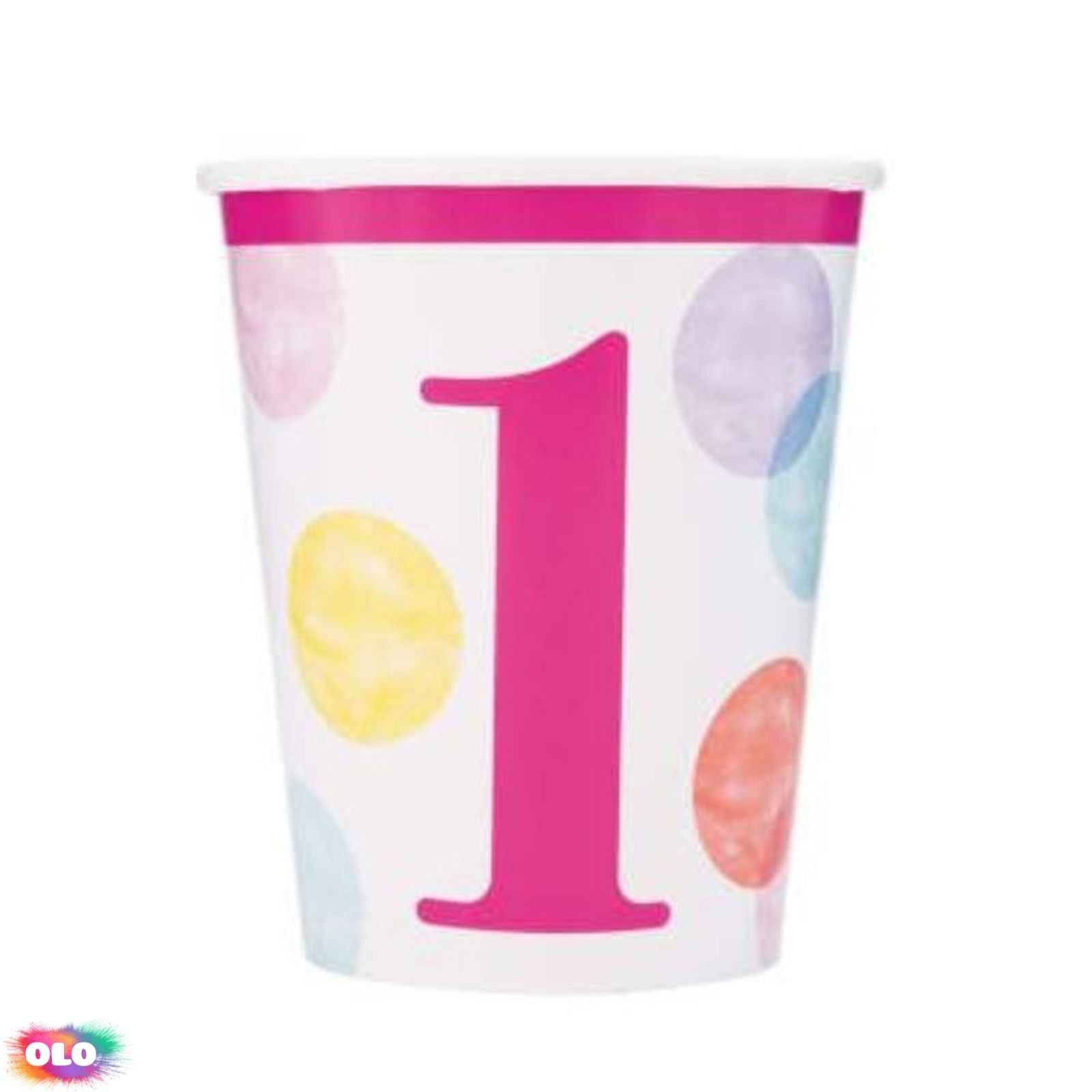 Papírové kelímky 1. narozeniny růžové s puntíky 270 ml, 8 ks