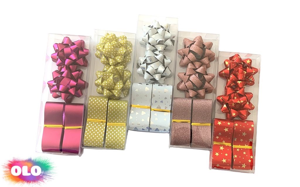 Krásná sada na balení dárečků, obsahuje dvě květinky ze stuhy a dvě stuhy o délce 3 m a šířce 3 cm. Květinka má v průměru 6 cm.
