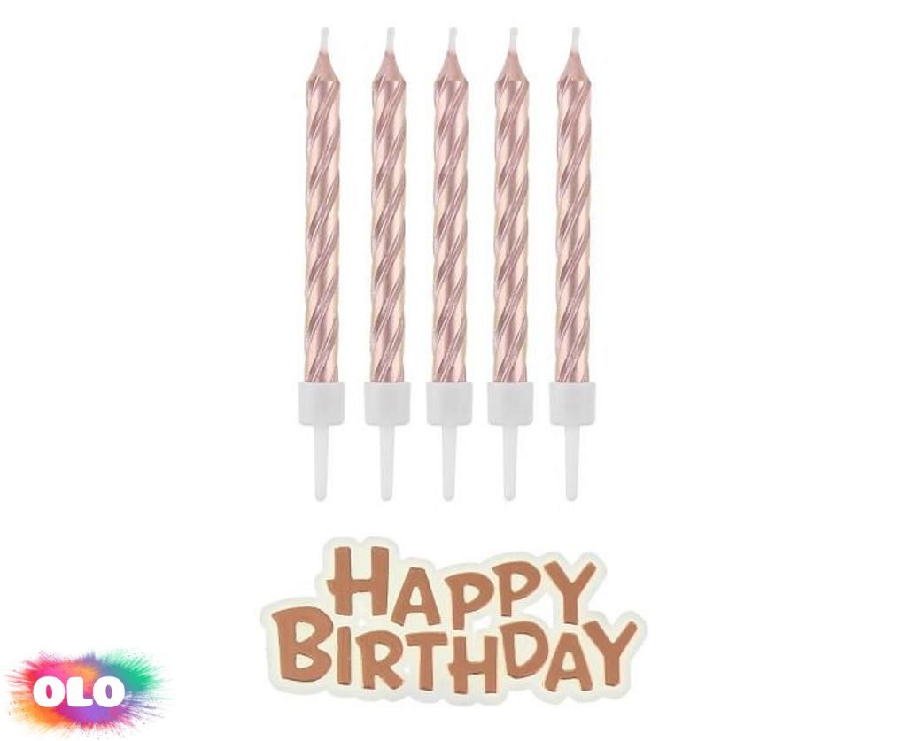 Elegantní růžovozlaté svíčky jsou dodávány s nápichem, který usnadňuje vložení do narozeninového dortu. Balení obsahuje 16 ks narozeninových svíček a dekorativní nápis "Happy Birthday". Výška svíčky s nápichem : 7 cm, Rozměry nápisu: 7 x 3 cm