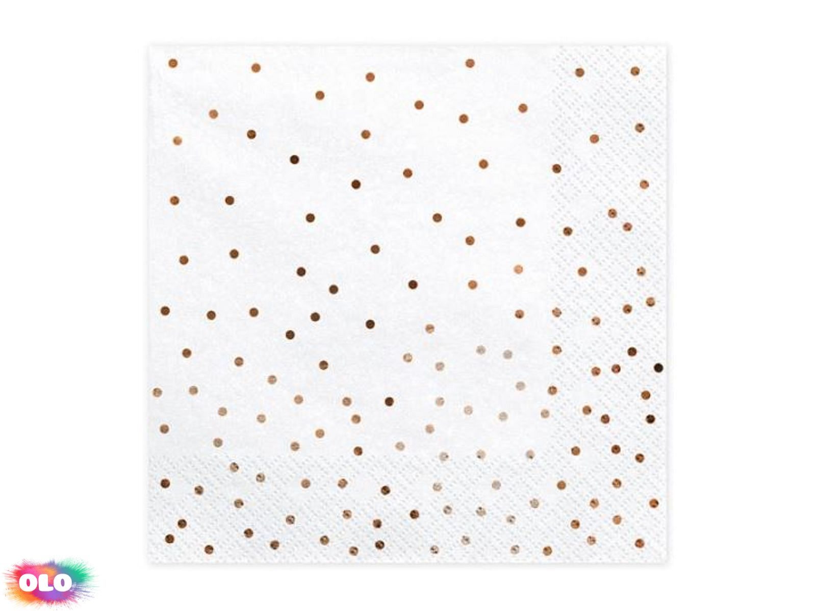 Bílé papírové ubrousky s elegantními růžovo-zlatými puntíky přináší šmrnc a půvab na každou oslavu! Perfektně se hodí pro svatební dekoraci stolu i pro další slavnostní příležitosti. Díky jemnému kontrastu barev vytvoříte atmosféru, která zaujme každého hosta.