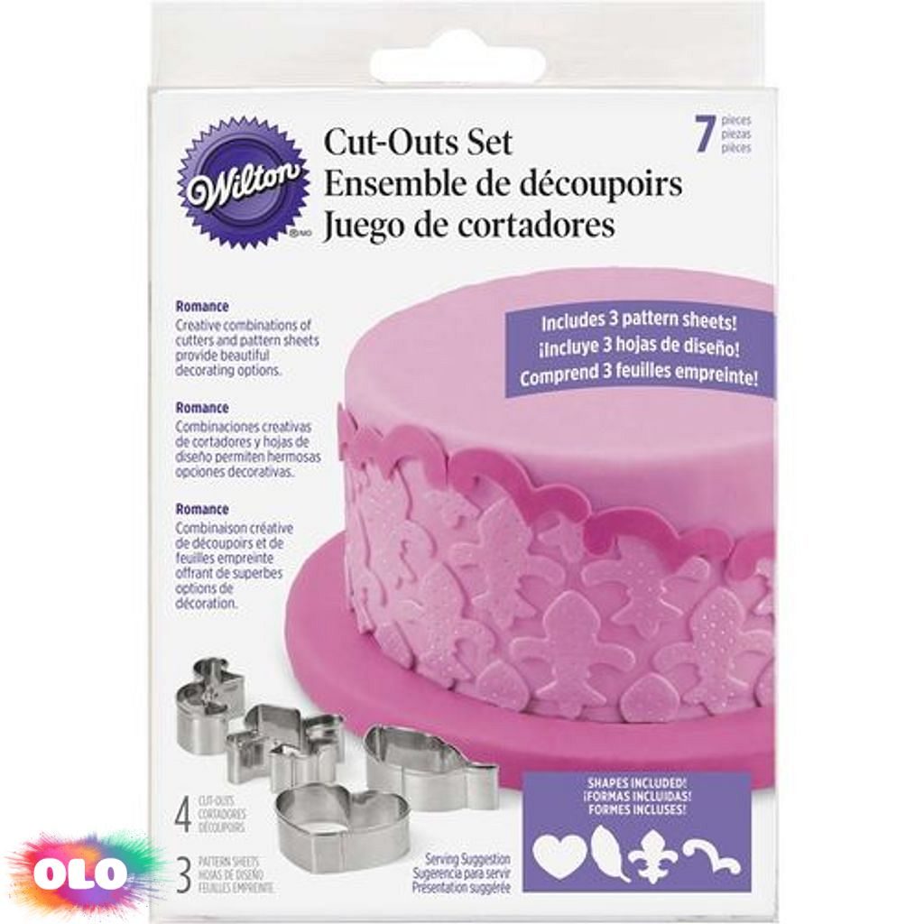 Vypichovače Wilton sada s motivy romance 7ks Sada obsahuje: 4 x kovové vypichovače nerez cca 4,5cm + 3 x plastové listy se vzory, pro strukturu a design fondánu 11,5cm x 10cm.