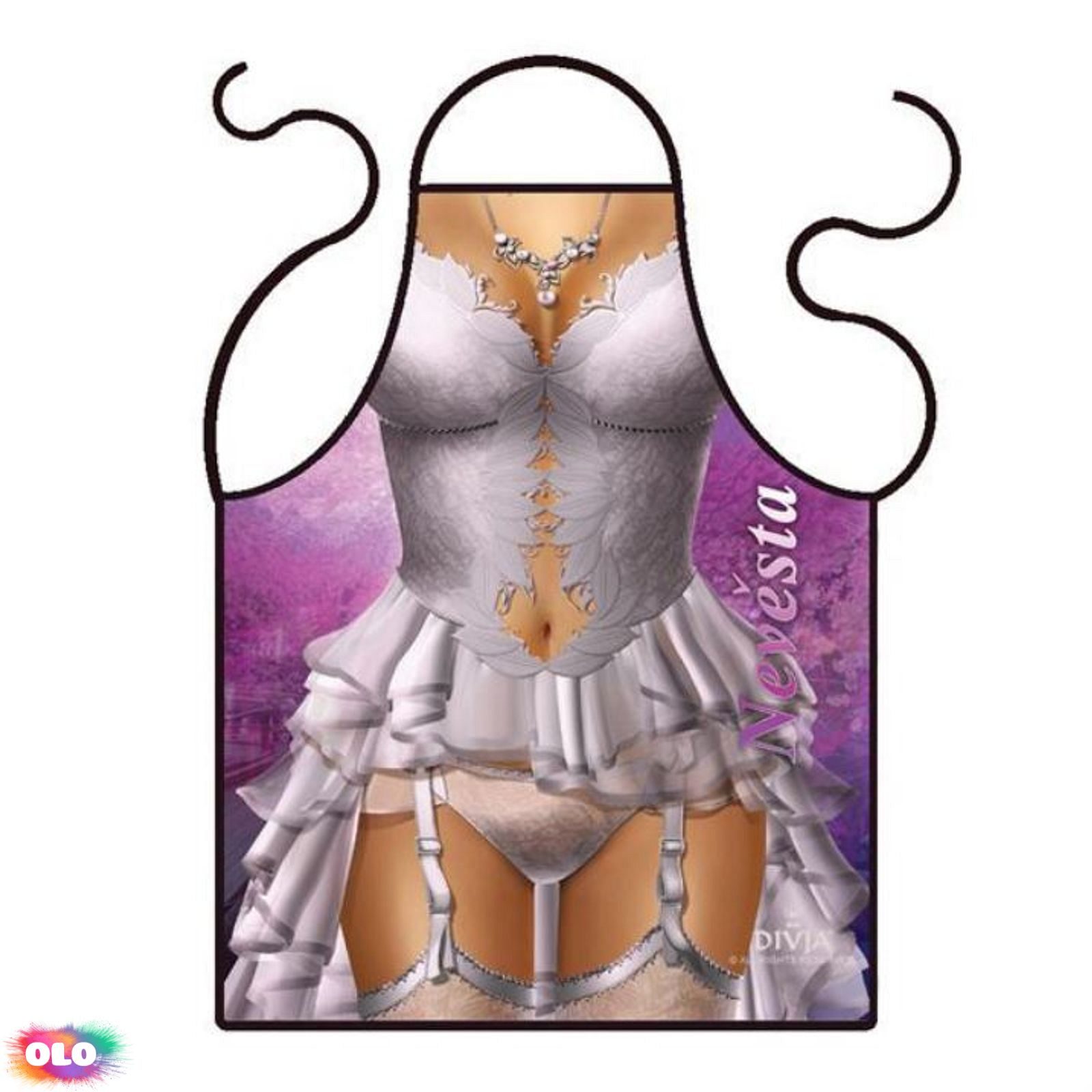 Zástěra Sexy nevěsta je klasická humorná kuchařská zástěra určená pro ženy, které si chtějí do kuchyně vnést trochu vtipu a originality. Tento nevšední model je ozdobený obrázkem nevěsty v erotickém oblečení. Ať už ji použijete jako svatební dar pro budoucí nevěstu, nebo jako vtipný kousek při rozlučce se svobodou, určitě sklidíte úspěch.